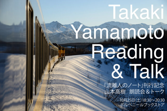 10月中旬の拙著新刊『流離人(さすらいびと)のノート』の発売に先駆けて、僕自身が、この本や過去の作品の中から選び出した文章を朗読するイベント「Takaki Yamamoto Reading & Talk」を10月12日(日)夜【※注:都合により、10月25日(土)夜18:30からの開催に変更になりました。ご注意ください】に開催させていただくことになりました。会場は神奈川県の大船にある書店、ポルべニールブックストアさん。少人数限定、配信なしのイベントになります(遠方にお住まいの方、すみません……)。